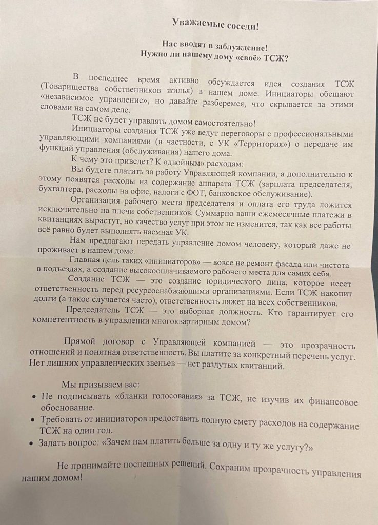 Кто вы? Эти Вы с нами в одной комнате? Почему ТСЖН имеет смелость подписываться под своими заявлениями, а «Вы» нет? Может потому, что «Вы» — это УК, которая вместо нормальной работы предпочитает сомнительные как с моральной так и законной точек зрения действия? Зачем тогда вы такие нужны? Чтобы что? Чтобы владельцы УК заработали денег?